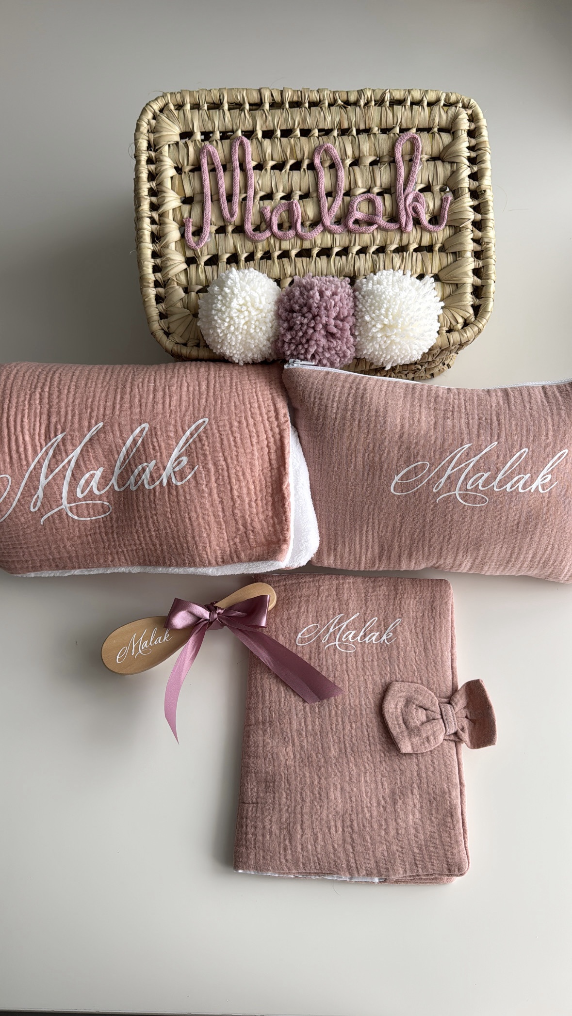 Coffret composé d’une valisette, couverture laine, protège carnet de santé, trousse de toilette, brosse en bois et attache tetine